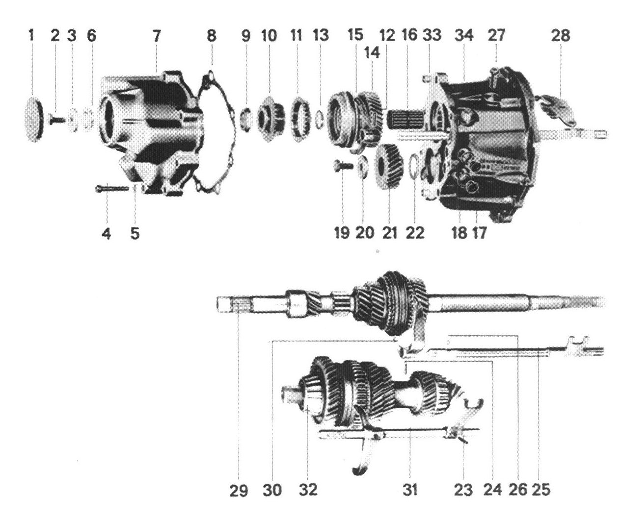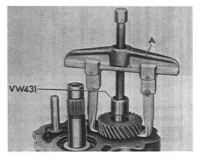 9. Remove 5th gear with sliding sleeve and synchronizer. needle bearing and 5th gear selector fork. Selector rod remains in gear carrier!
