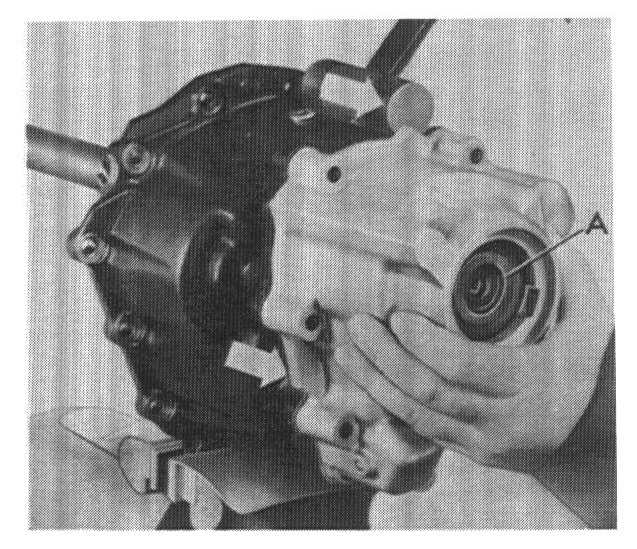 4. Drive off rear cover with a plastic hammer and remove 1st inner race/ball bearing (A).