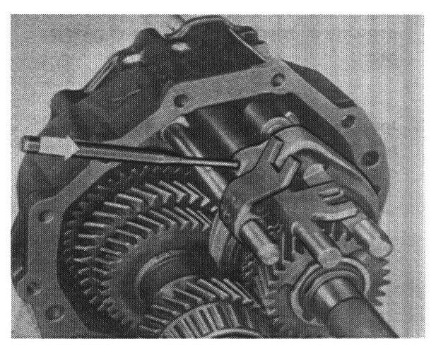 17. Pull out selector rod for 3rd and 4th gears (selector fork remains in sliding sleeve). Do not loose small lock pin!