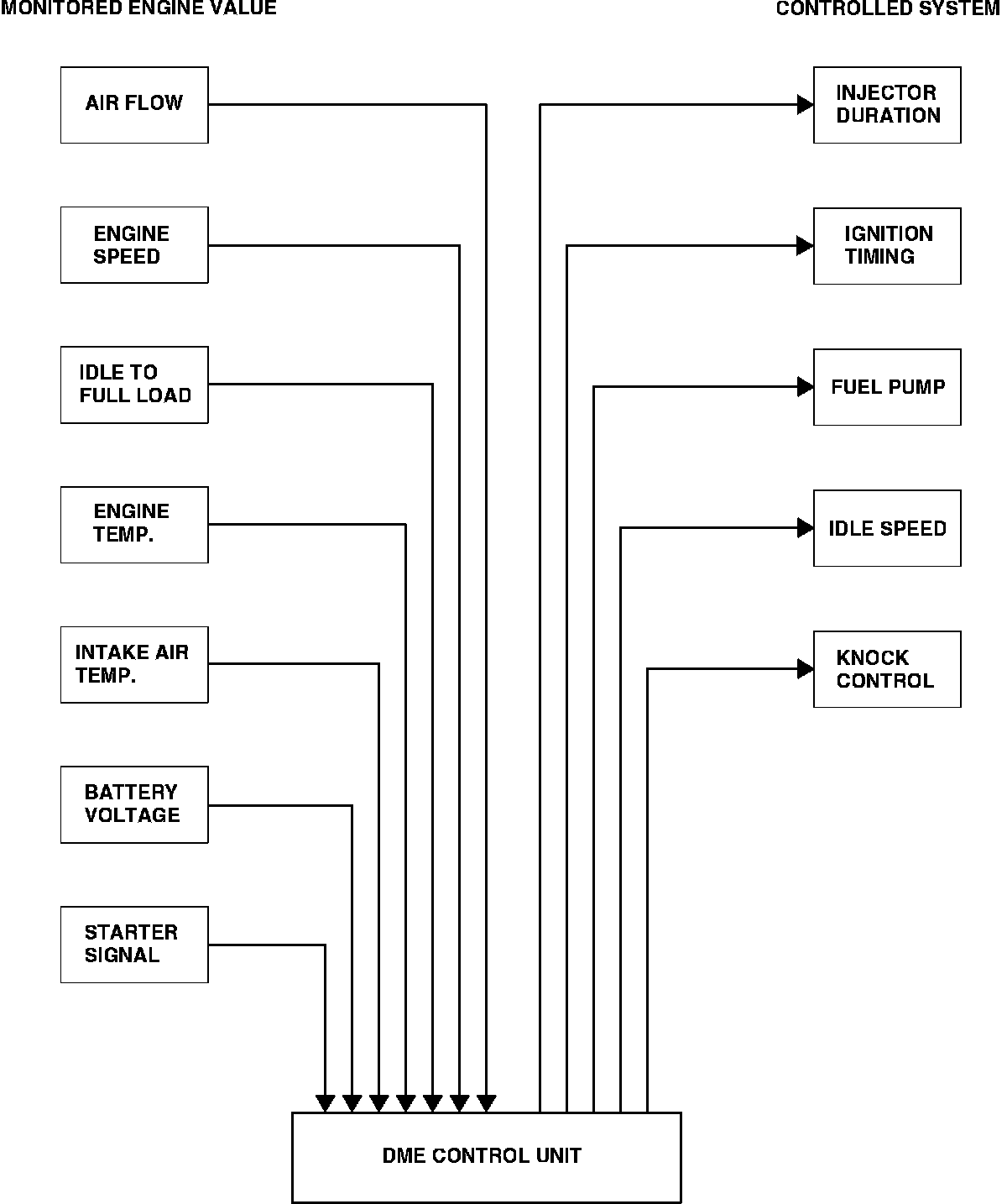 Digital motor electronics (DME) is used to control engine operation. Fuel is delivered to the via a Bosch L-Jetronic electronic fuel injection system. Using sensor input, it is able to monitor engine speed, load, temperature, fuel mixture and, through the knock/charging pressure (K/CP) control unit, preignition. These inputs are applied to preprogrammed "maps" to determine output characteristics necessary for optimum fuel economy and performance.
