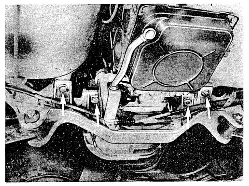 21. Remove two bolts from transmission mounts and two bolts holding rear axle cross member to frame.