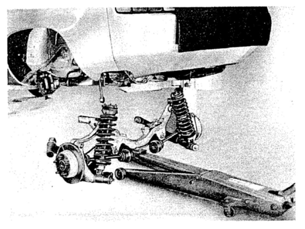 25. Lower rear axle carefully and be careful that spring struts, cross member and bearing brackets do not tilt.
