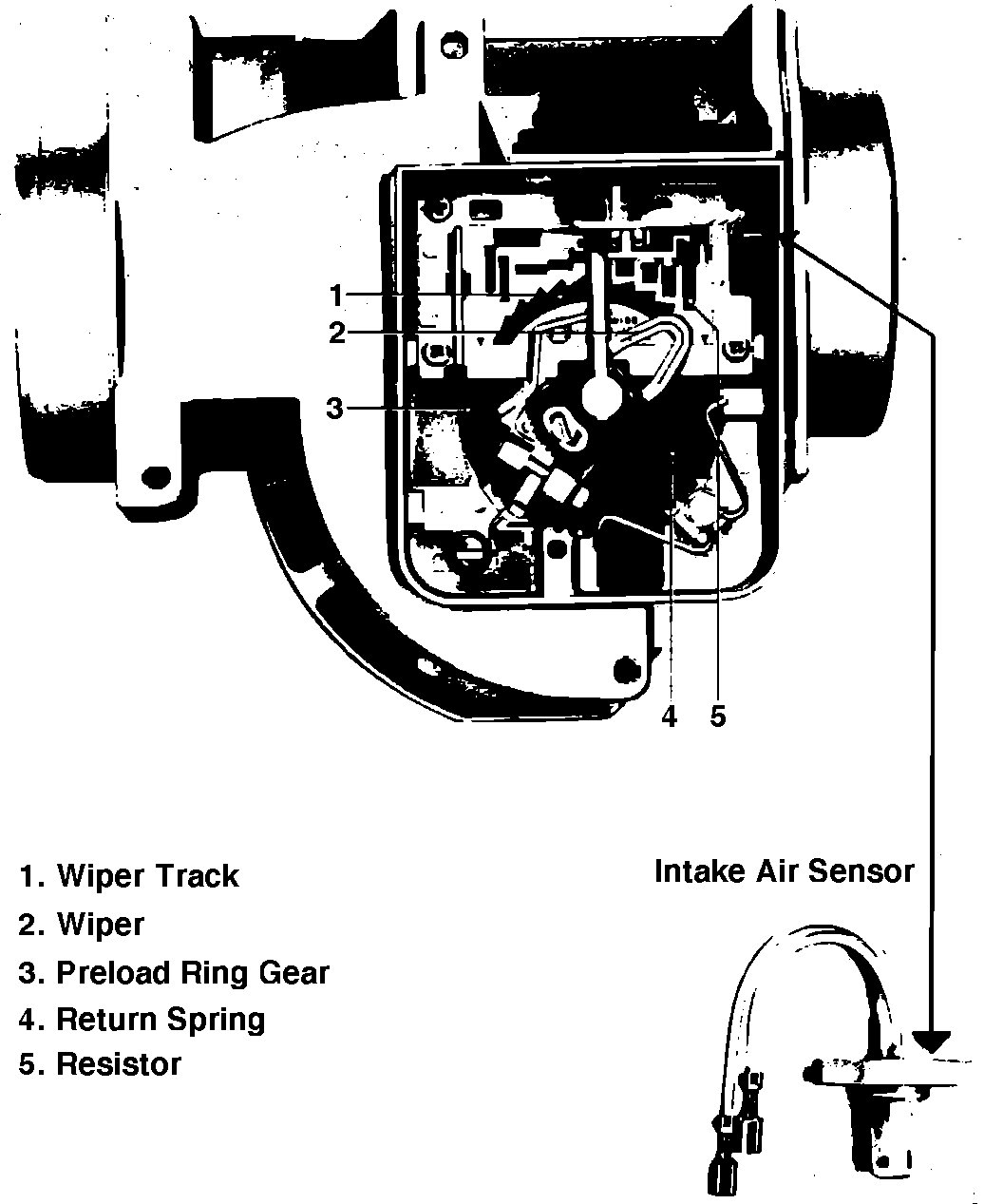 The intake air flow is determined from a signal produced by a potentiometer in the air flow meter. The potentiometer is connected to the measuring flap. As air is drawn into the engine, the flap is deflected which causes the wiper contact of the potentiometer to move. The potentiometer signal represents the air volume entering the engine.