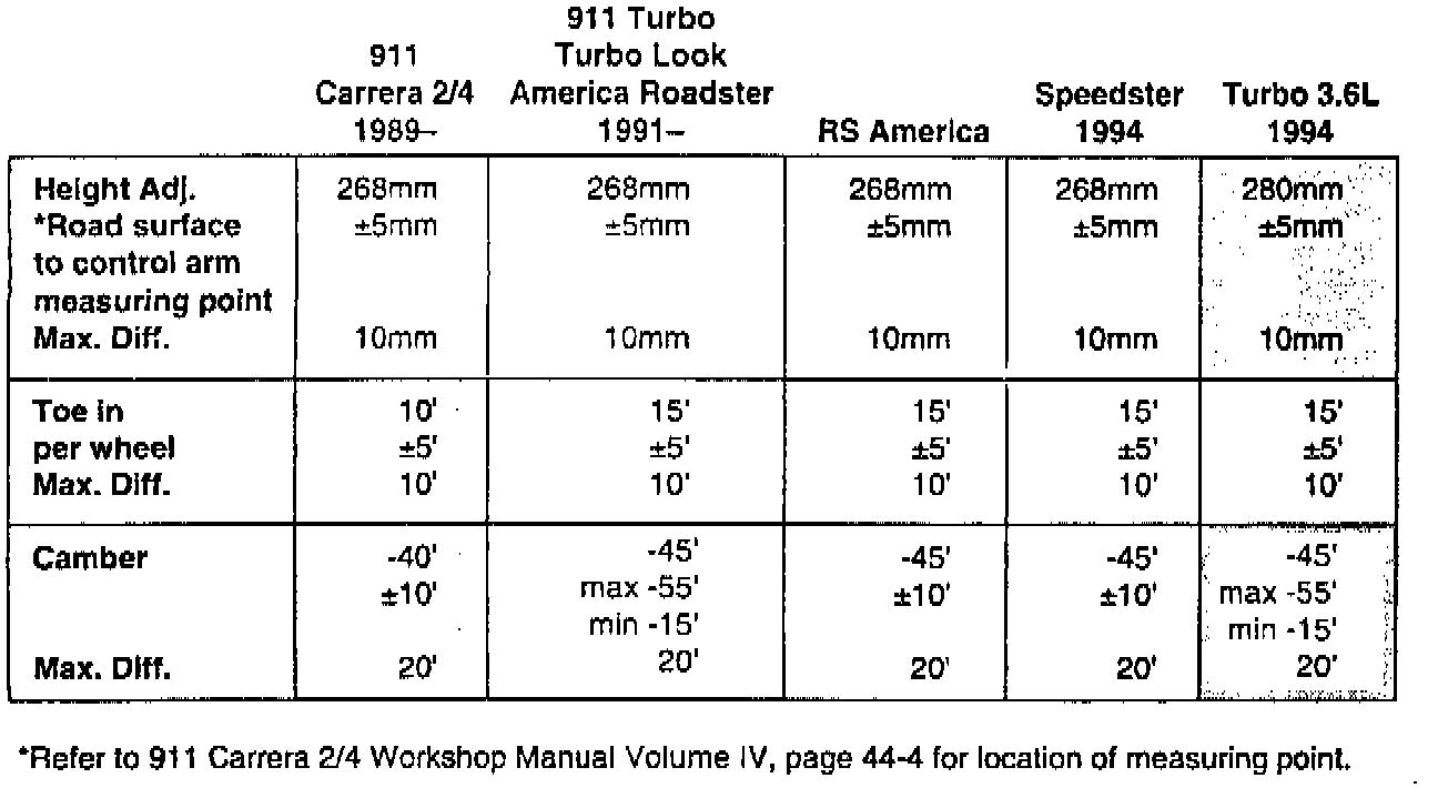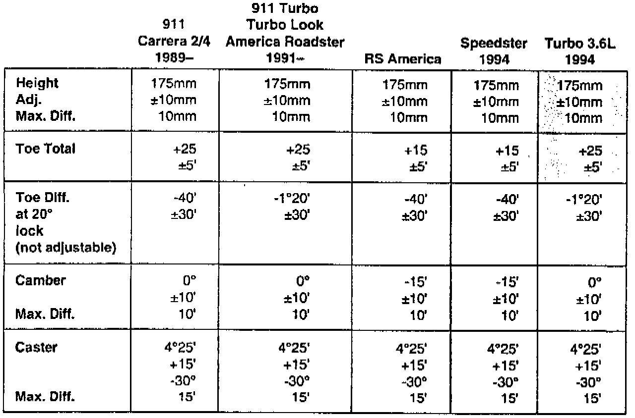 Specifications that have changed are in the area of 911 Carrera 2/4 rear toe and camber, 911 3.6 liter Turbo front height, rear height, front toe, front camber and rear camber.