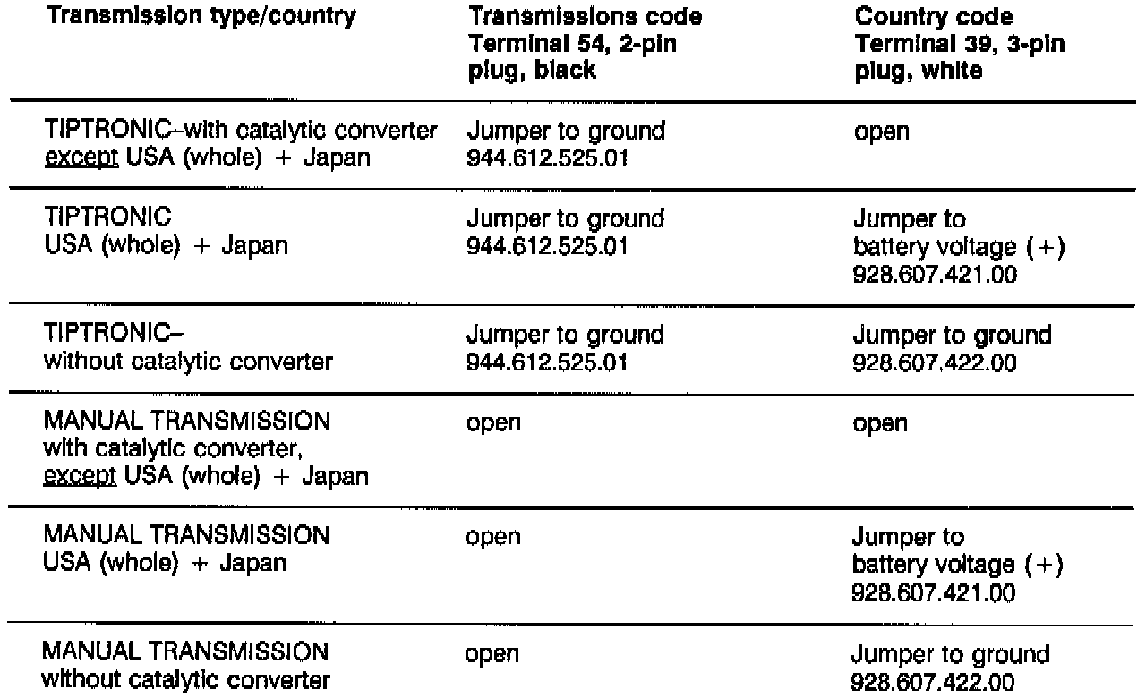 In order to permit calling up of these characteristic maps, a 2-pin plug connection and a 3-pin plug connection are brought out of the DME wiring harness. These must be jumpered differently, depending on the country-specific version.