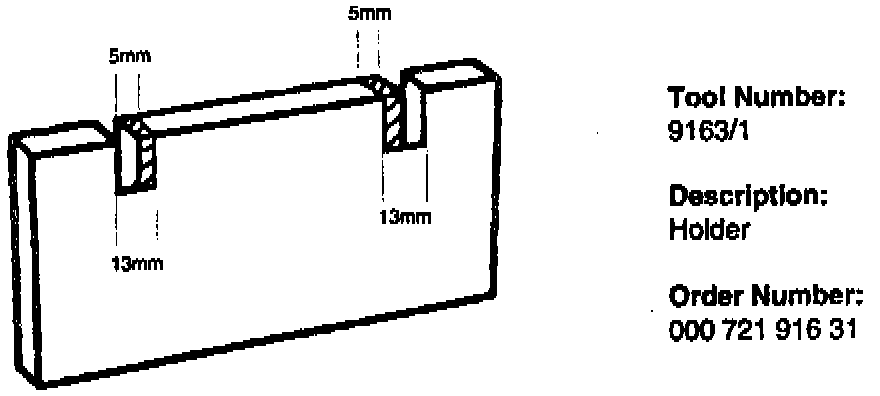 When removing a 1993 and later 928 GTS 5-speed transmission, Porsche Special Tool 9163/1 will need to be modified in order for the transmission to be supported properly. The upright Special Tool 9163/1 needs to be widened in the area of each slot by 5mm by removing material from the center of tool. See the illustration for details of the modification.