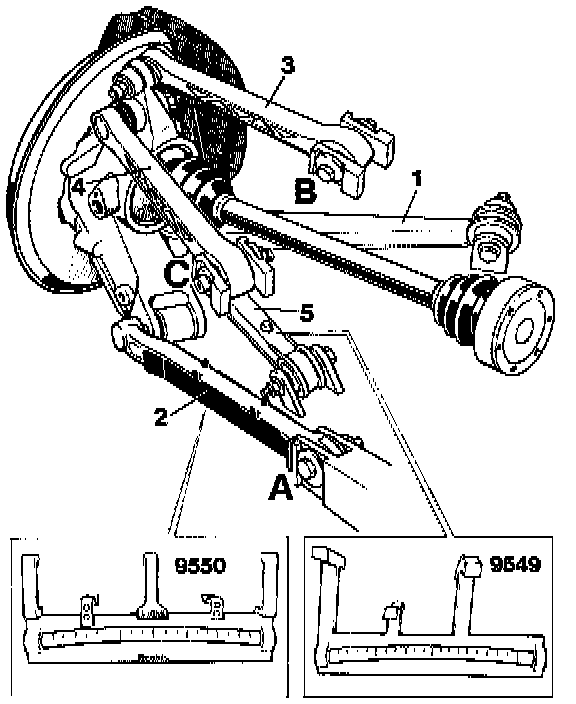 - To adjust, mount the Special Tools (measuring gauges) 9549 and 9550 to control arm 2 and control arm 5.