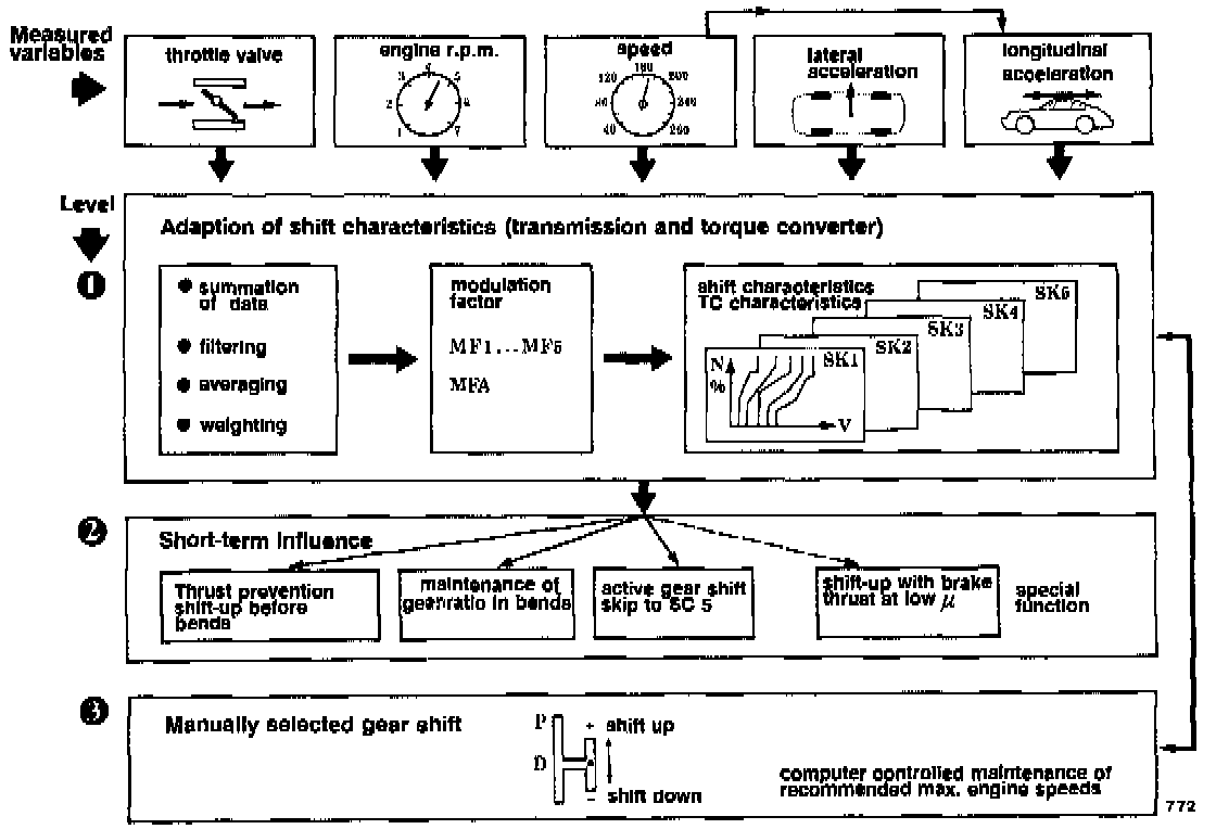 The transmission is controlled by an electronic transmission control system that selects automatically among five different shift maps (SC1 = map for very comfortable and economical driving, to SC5 = map for very sporting driving).