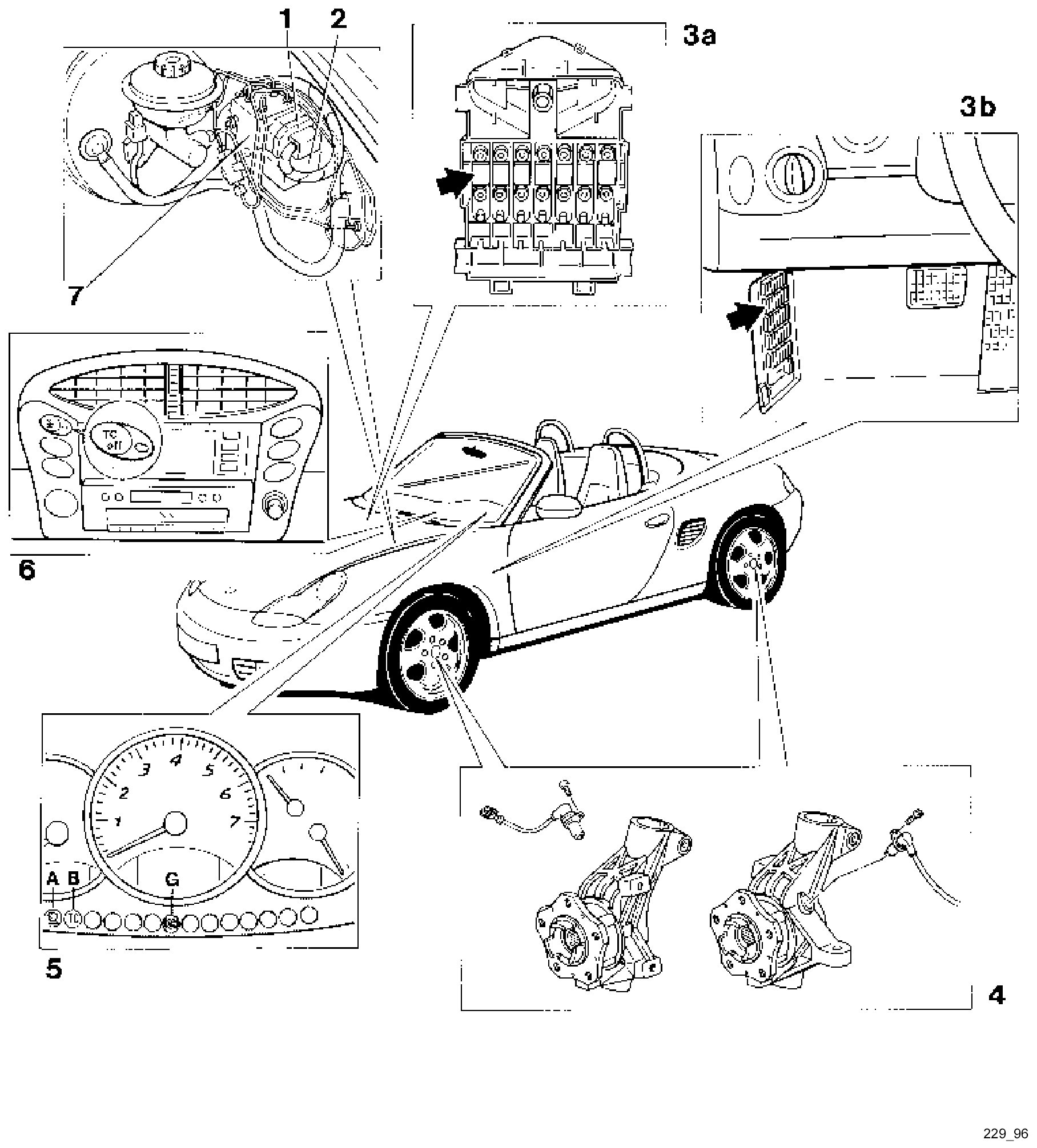 3b. The 15-A fuse F 2/9 (field 2, No. 9) on the central electrical board protects the control modules electrical supply (ABS and ABS/TC). The arrow points to field 2.