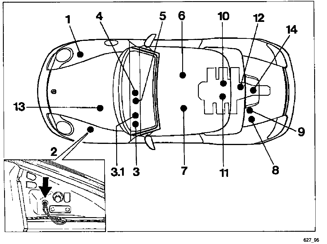 - Important ground points for ABS and ABS/TC: Ground point 2 (on the left in the front luggage compartment) and ground point 5 (electronics ground).