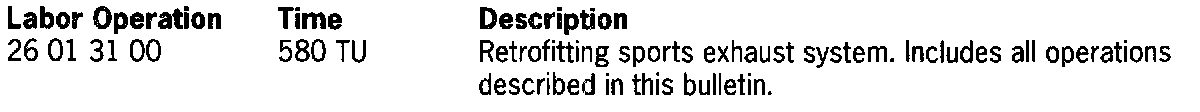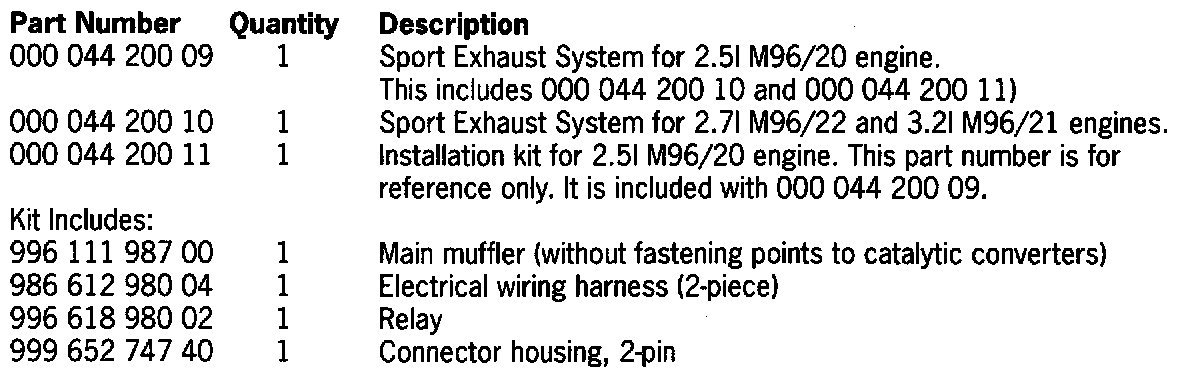 The Sports Exhaust System is available for 2.5 I M96/20, 2.7I M96/22, and 3.2I M96/21 engines. The sound behavior of the system is controlled as a function of the vehicle speed. The sports exhaust system has two extra exhaust passage ways which are opened and closed by control flaps. The flaps are activated by means of a control unit, which receives a speed signal from the speedometer. This exhaust system produces a sporty, powerful sound when both flaps are open. Visible differences between the sports exhaust system and the standard exhaust system are: