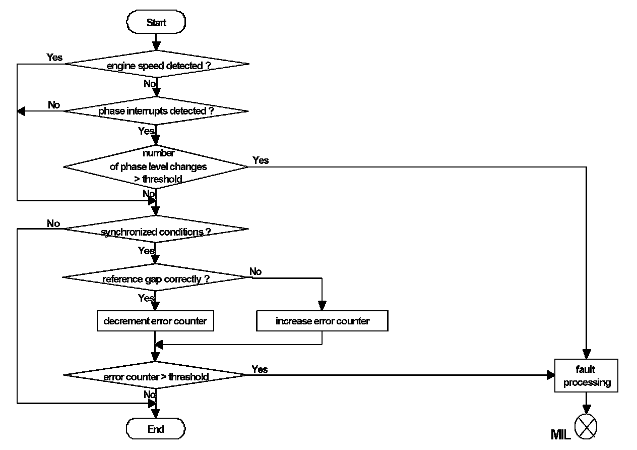 Under normal operating conditions, the flywheel position reference gap is monitored. At a loss of synchronization (more than one tooth difference between expected and observed gap position), the error counter is increased. If the gap is determined correctly the error counter is decreased. As soon as the error counter reaches a certain threshold an engine speed sensor malfunction is detected (see Diagnosis of Engine Speed Sensor).