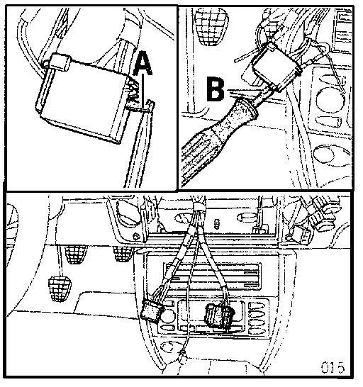 6.1.2 Unlock locking lugs (B) on both sides and remove fuse block 'E' from fuse carrier.
