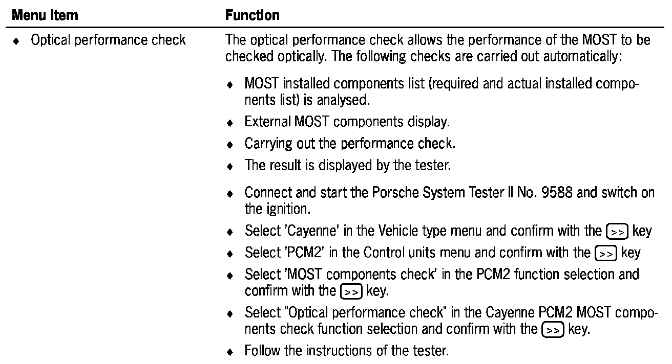 The MOST component check can be reached via the menu PCM2 function selection. This comprises a summary of the following check processes: