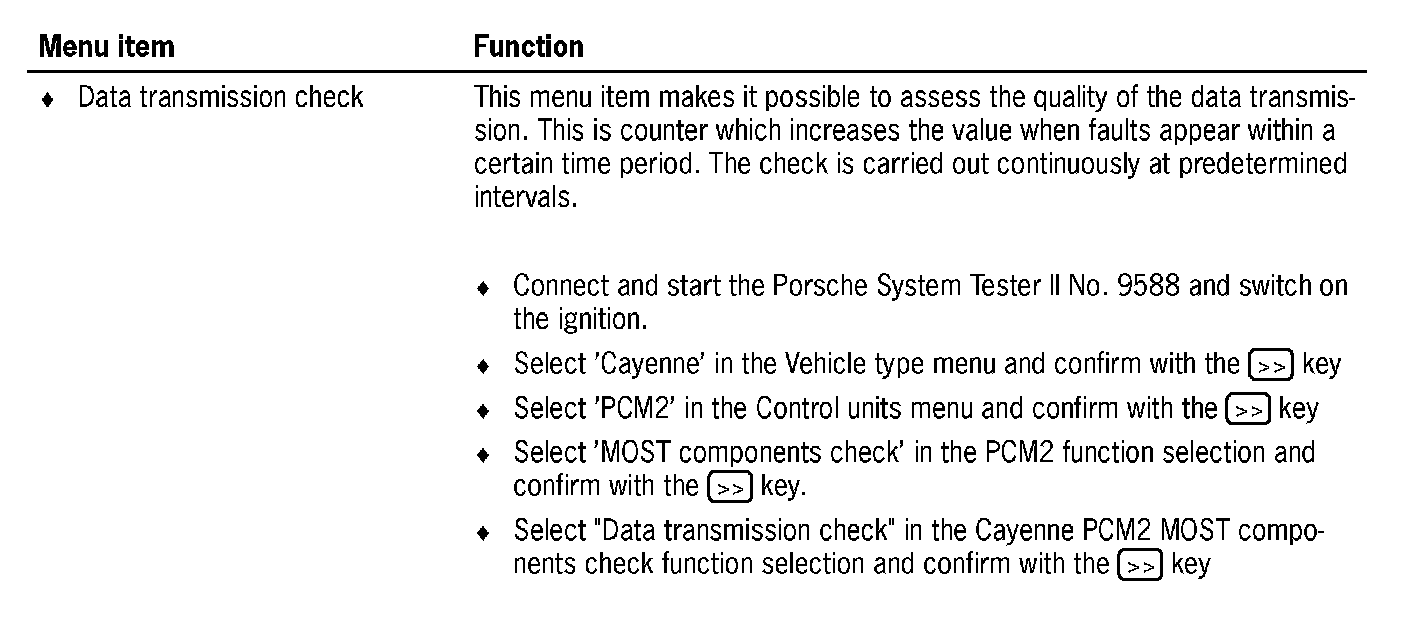 Communication between the Porsche System Tester II No. 9588 and the MOST control modules only takes place via the K lead to the instrument cluster. The data is transferred from the instrument cluster gateway to the MOST control modules via CAN Infotainment to the PCM2 gateway, via the electrical MOST in the PCM2 and via the optical MOST outside of the PCM2.