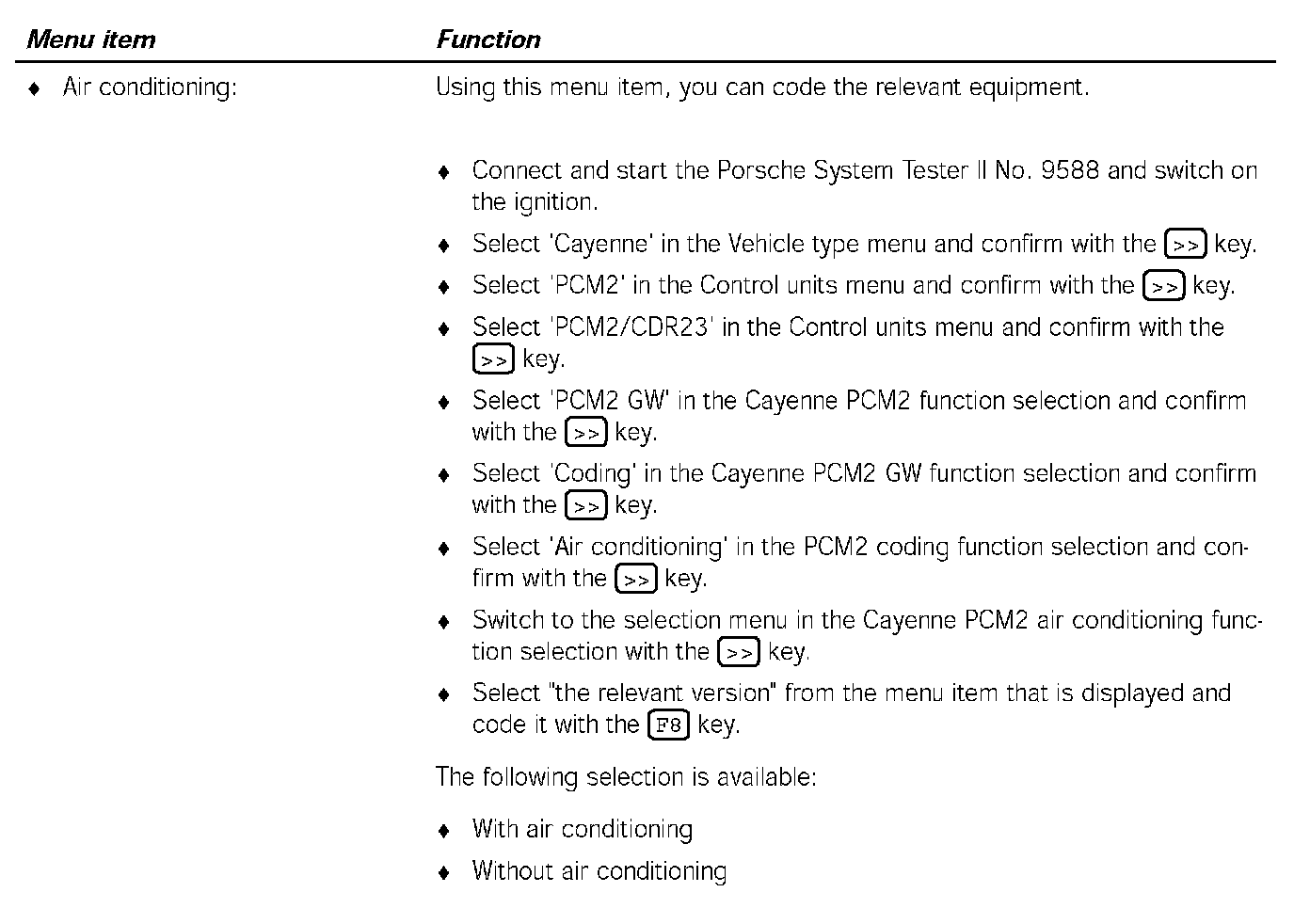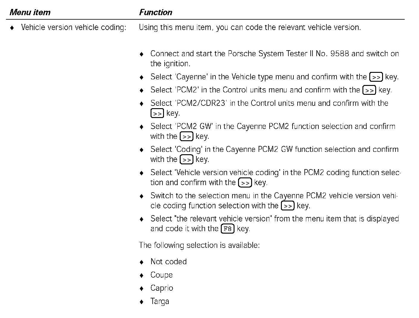 5. Select 'PCM2 GW' in the Cayenne PCM2/CDR23 function selection menu and confirm with the [>>] key.