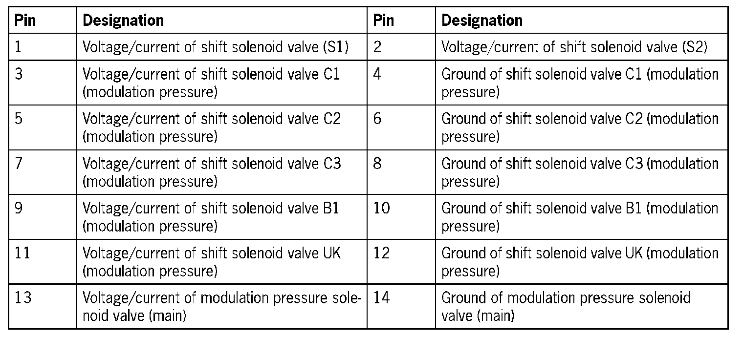 Socket for solenoids (transmission side) 'A', '14-pin' and sensors (transmission side) 'B', '8-pin'