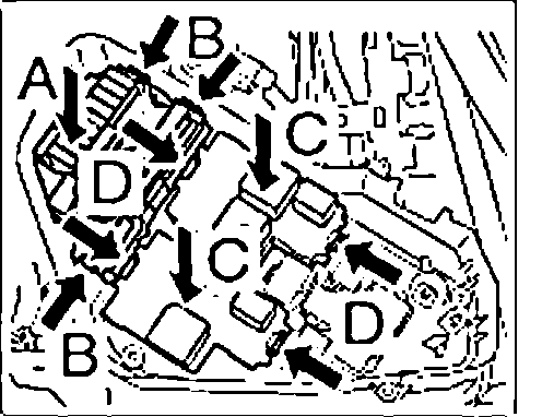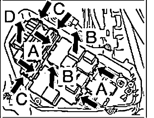 13. Release fuse carrier "arrows C" and pull it out and up "arrow D".