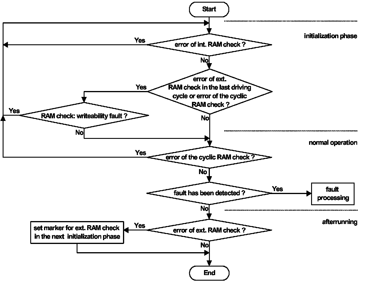 A cyclic RAM check, which checks the writeability of the function monitoring, is performed continuously. A fault detection causes a RESET with a repeated RAM check in the initialization phase as above (see next pages).