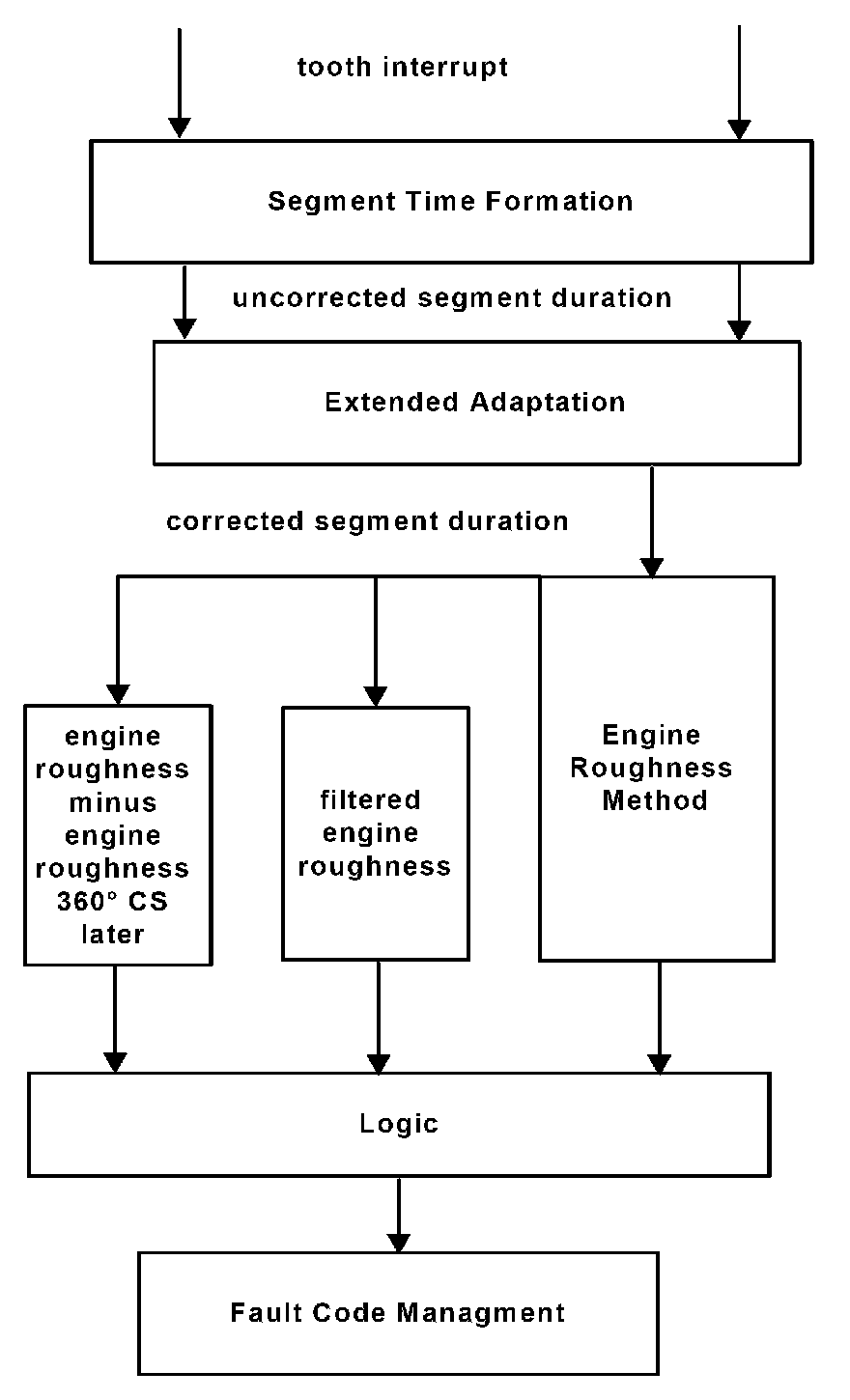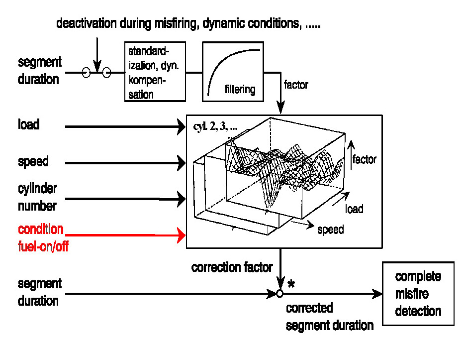 The adaption during fuel cutoff (fuel-off adaption) and during firing operation (fuel-on adaptation) learns the systematic differences of the segment times dependant upon the individual cylinder's characteristics, see Diagnosis of Misfire Extended Adaptation. The correction values are included in the processing such that after adaption the resulting segment times are identical (apart from the stochastic signal-to-noise ratio in steady-state).