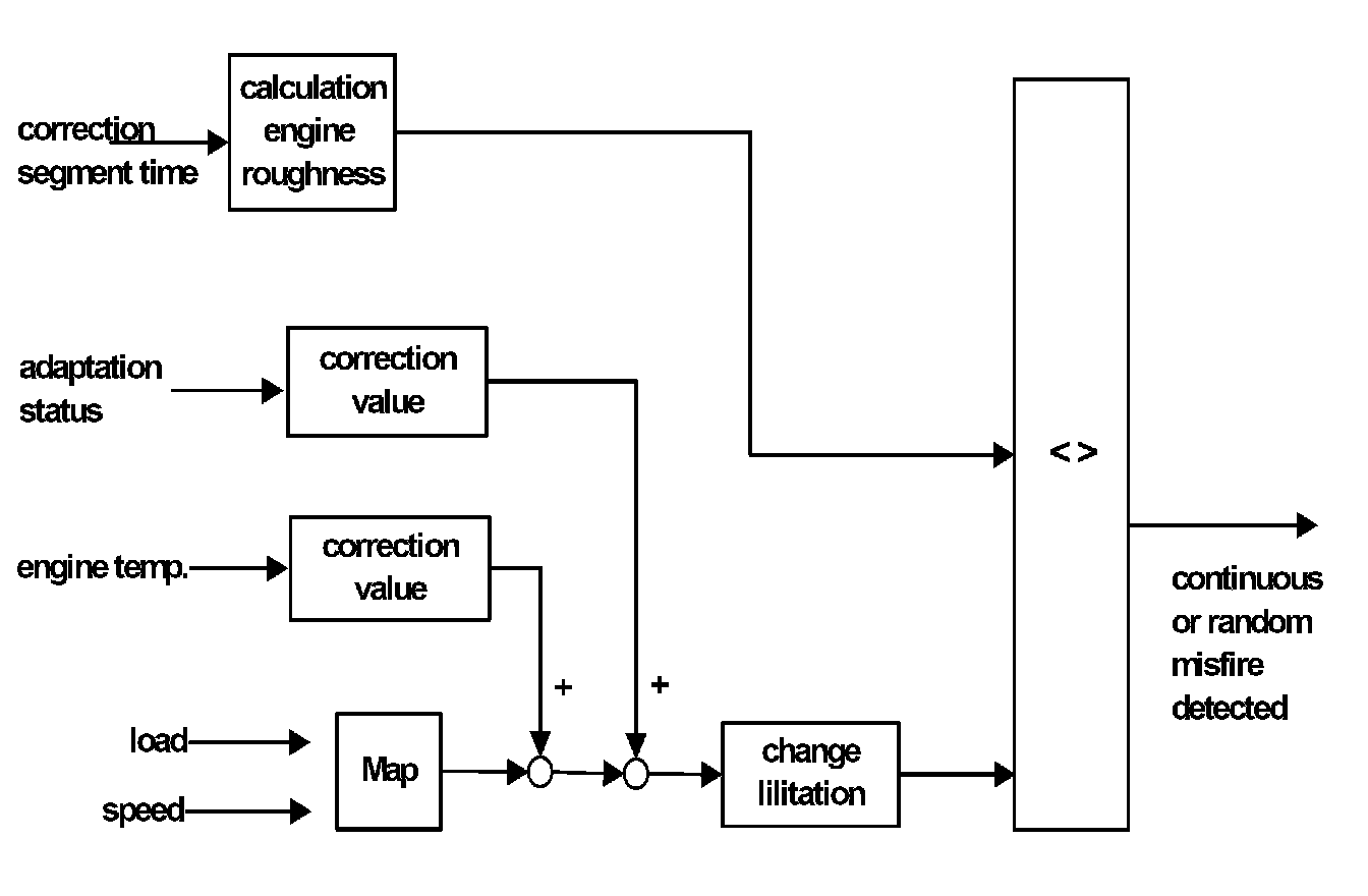The detection performance is independent of sensor wheel inaccuracies (crankshaft-synchronous segment time fluctuations). However, symmetrical multiple misfires which can also generate crankshaft-synchronous segment time fluctuations cannot be detected. A calculated value is compared to a load and speed dependant threshold. If this threshold is exceeded misfire is detected.