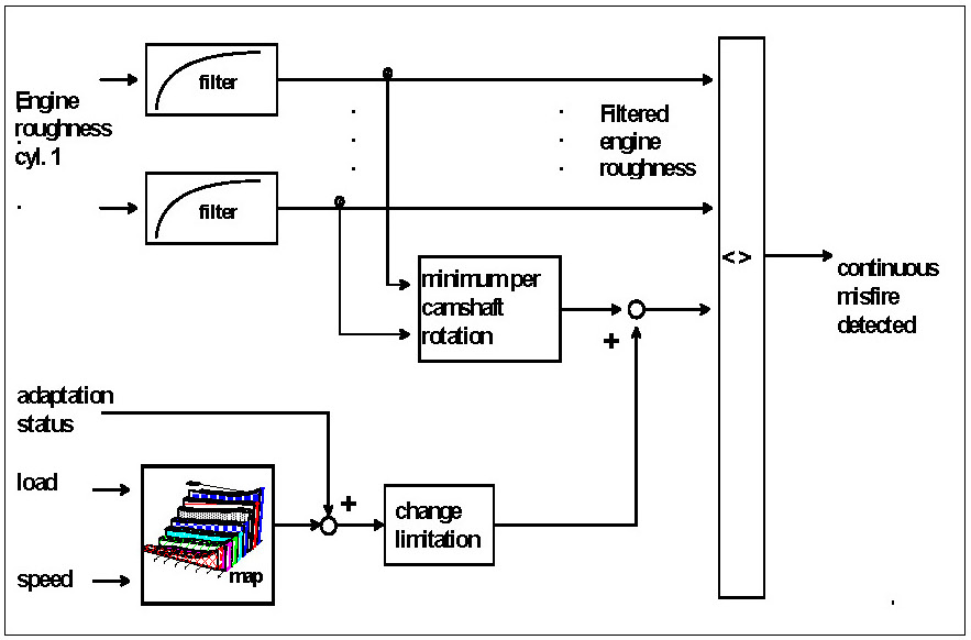 This function allows detection of continuous misfire in one or more cylinders, see Diagnosis of Misfire - Filtered Engine Roughness. For this the cylinder-specific engine roughness values are filtered by means of recursive low pass filters and compared to an accompanying threshold / reference value.