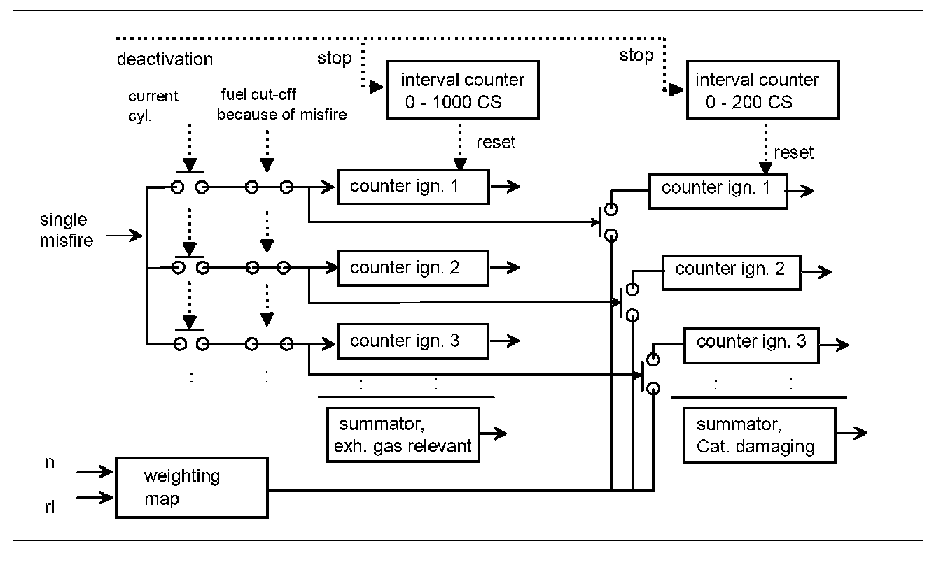 Each combustion, apart from those intentionally deactivated, must be checked for misfire since misfire can be distributed randomly, see Diagnosis of Misfire - Fault Code Management. However, a reaction will only take place if a certain misfire frequency is given. The different effects of the combustion misses, such as increase in exhaust emissions, and catalyst damage, are evaluated separately.