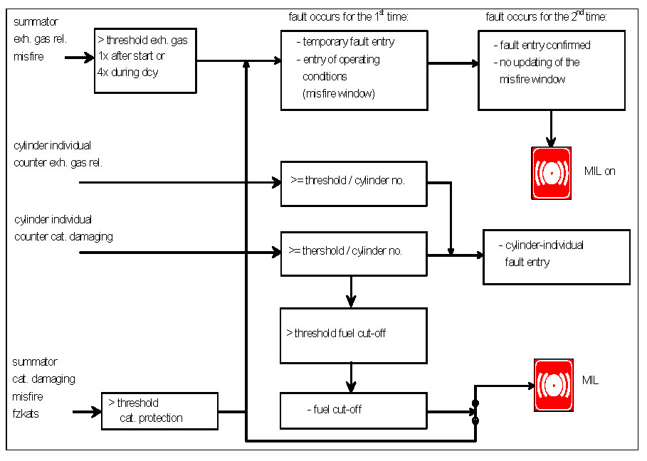 The misfire detection system consists of various subfunctions, which together guarantee a complete detection of all misfires, see Diagnosis of Misfire-Overview. Common to all methods is the evaluation of segment durations, which are corrected by means of an adaption. The misfire detected by each of the individual methods are logically OR'd together and then further processed in the fault code management system. The fault code management system determines, among others, when the MIL is to be triggered.