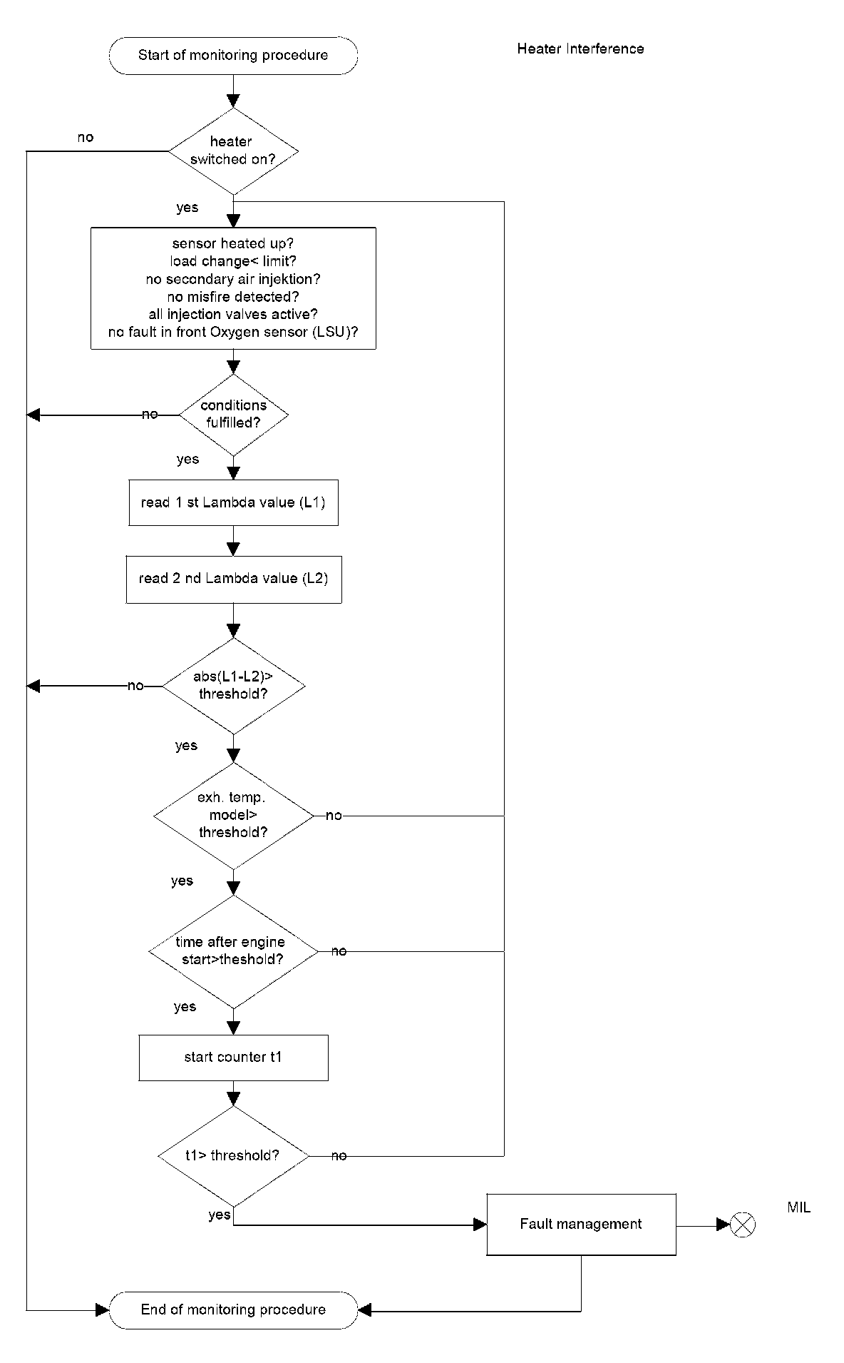 For diagnostic of the sensor heater a specific current pulse is supplied via a load resistance and the voltage is measured. The internal resistance of the sensor heater is calculated with the voltage deviation. The result will be compared with a reference map resistance, which considers aging and sampling deviations. In case of internal resistance > map resistance the diagnosis stores a fault and the MIL will be illuminated.
