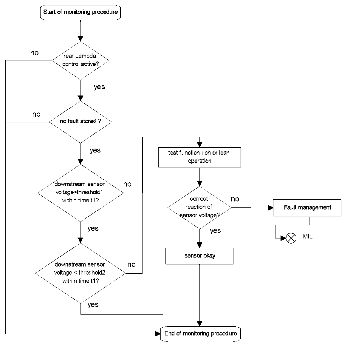 The Lambda value of oxygen sensor upstream catalyst is compared to the sensor voltage downstream catalyst. Additionally, a hardware check is performed by checking the sensor voltage range. Three diagnostics paths covers the air fuel ratio range of Lambda value (e.g. Lambda=1, lean, rich). A corresponding reaction of sensor voltage downstream catalyst is expected.