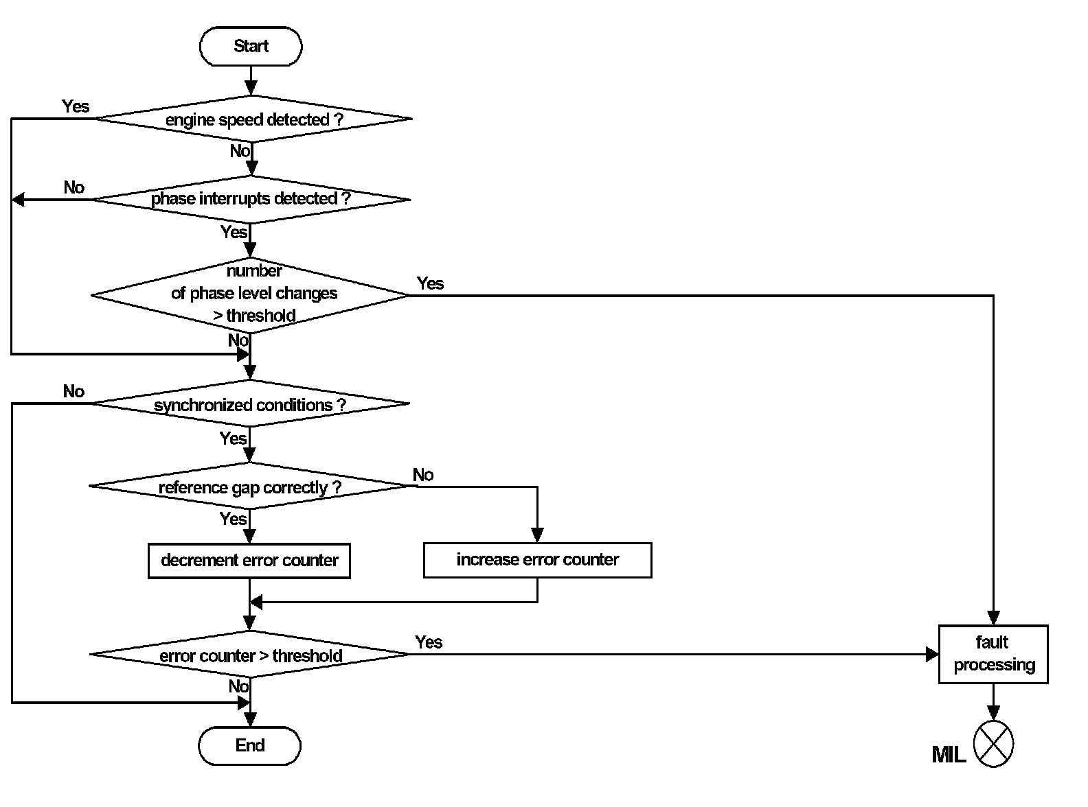 If no engine speed is detected the number of phase sensor interrupts will be checked via a phase interrupt counter. If more than a certain number of phase signal level changes are monitored while no engine speed signal is present an engine speed sensor malfunction is detected.