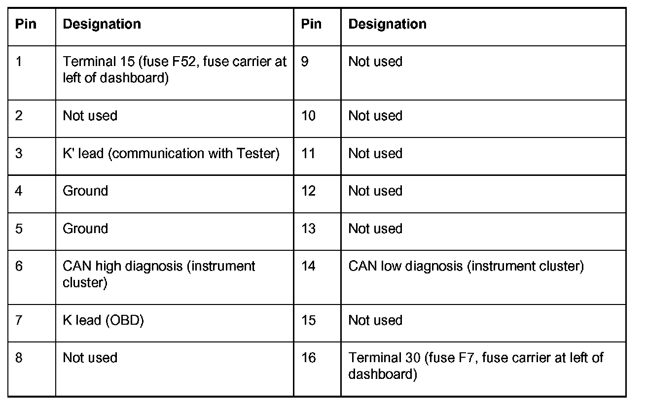 - Pin 3 terminal 30 power supply via fuse F29/fuse carrier at right of dashboard