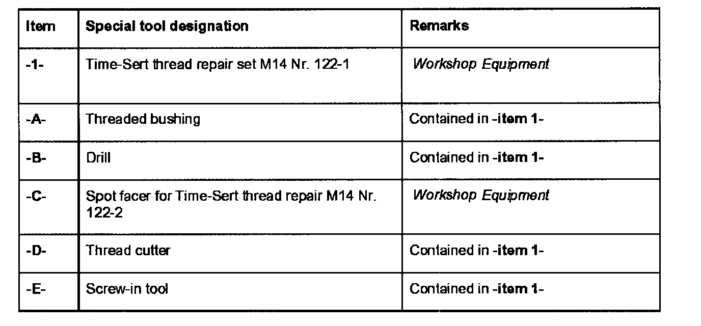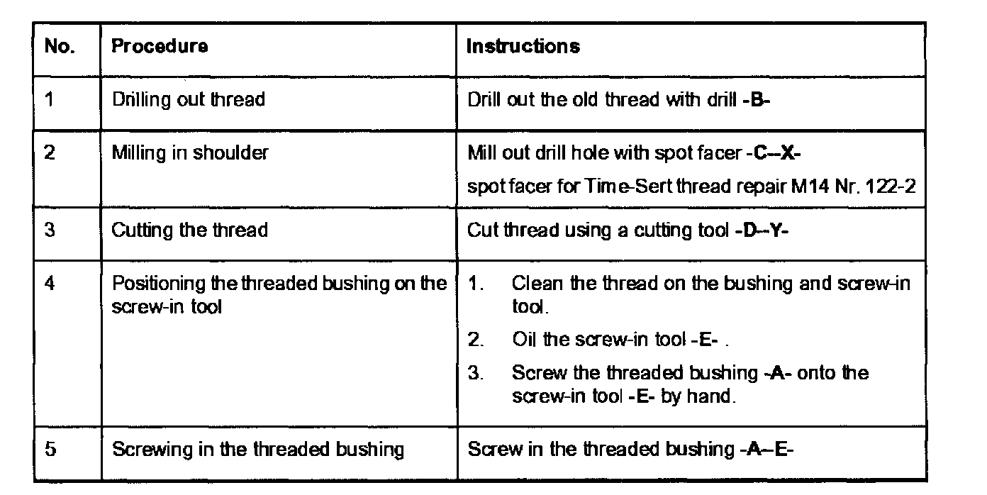 NOTE: The repair bushing must be installed recessed. To mill in the respective shoulder, the tool with the designation Spot facer for Time-Serf thread repair M14Nr. 122-2 must be used. The tool provided with the complete set supplied must not be used in this case.