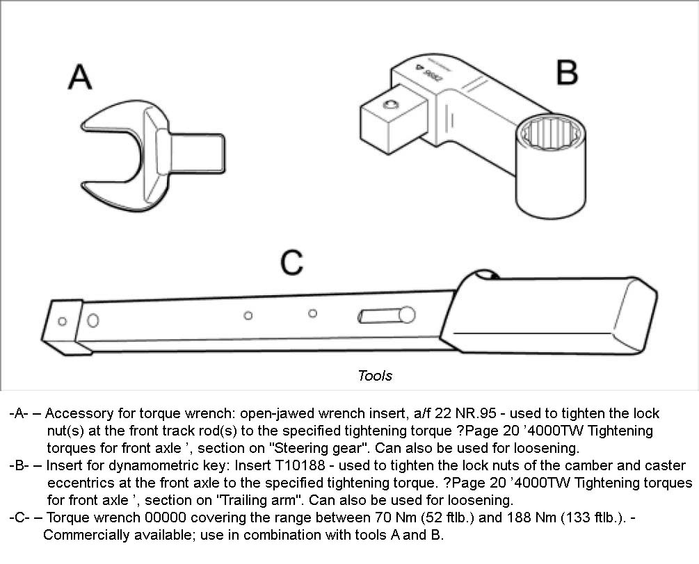 Tighten lock nut on tie rod at -C- to 70 Nm (52 ft lb.) in conjunction with accessory for torque wrench: open-jawed wrench insert a/f 22 NR.95.
