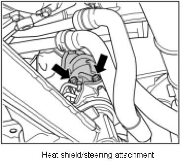 4. Remove cover for underbody (transmission protection) and heat shield from the steering -arrows-.