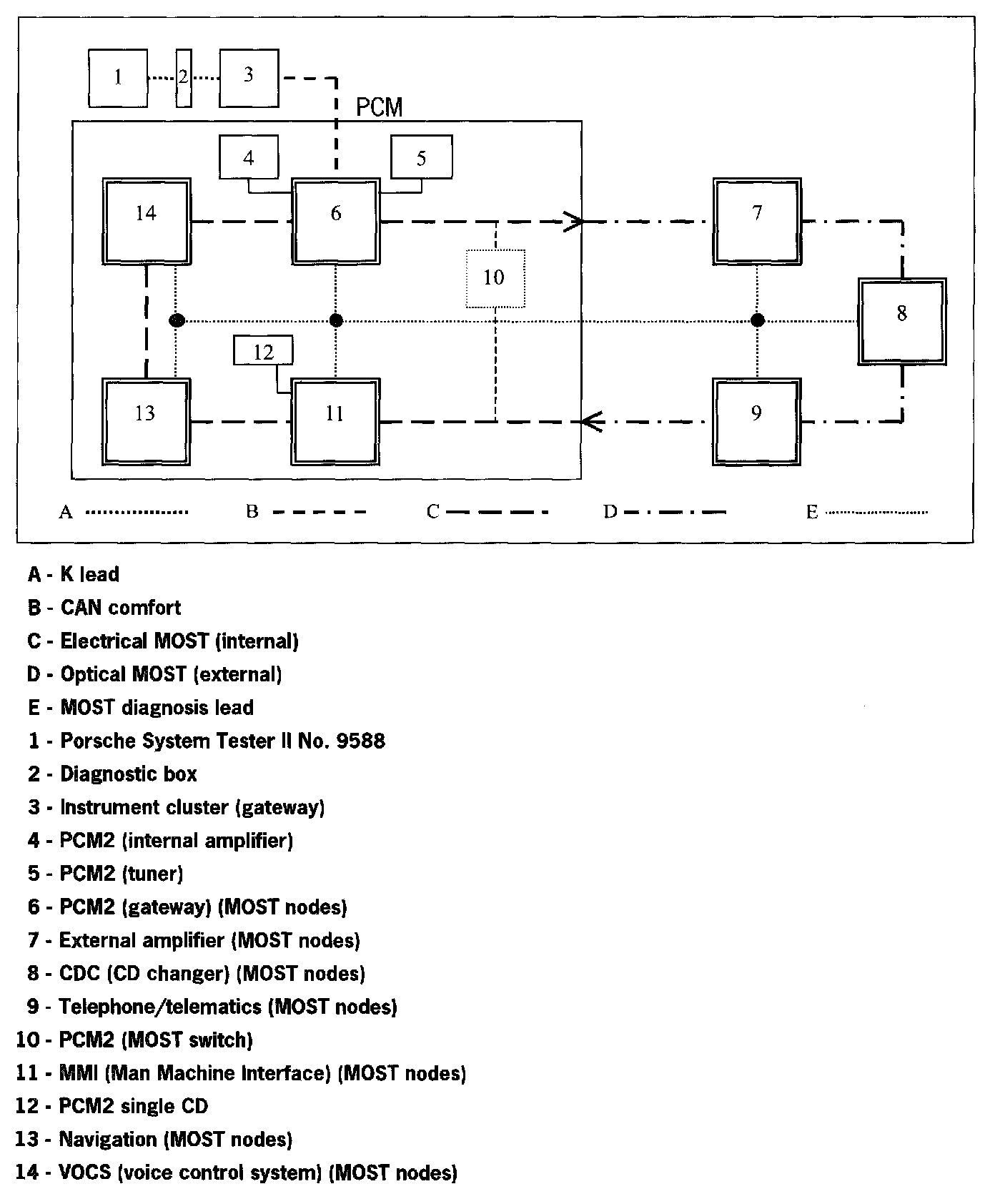 The PCM2 consists of at least two but a maximum of four MOST nodes, (Gateway, MMI and Navigation and VOCS (optional)), which communicate with each other via the electronic MOST. Data is transferred outside of the PCM2 via the optical MOST.