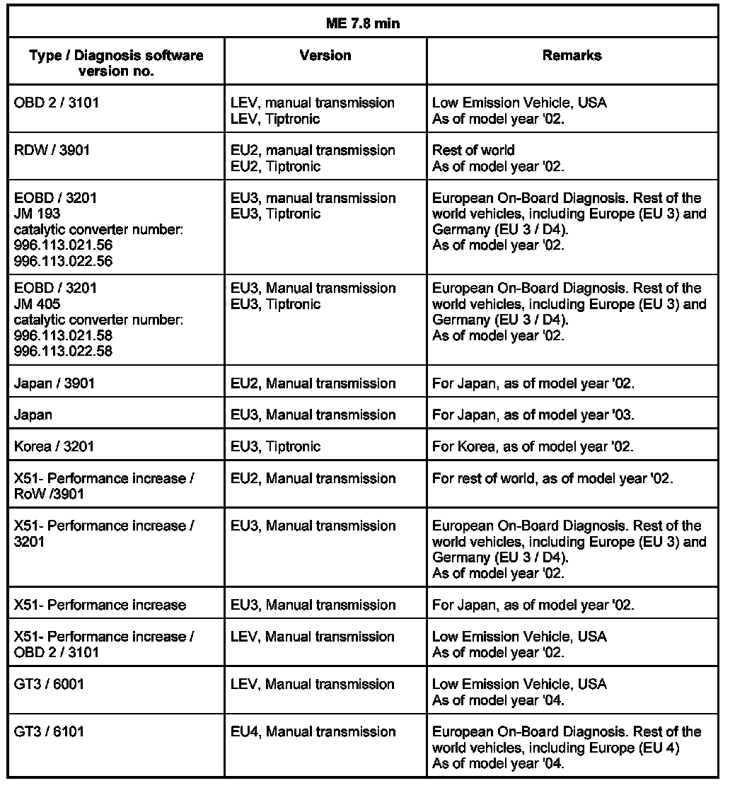 - A differentiation is made in the EU3 version under JM 193 and JM 405. This is due to the fact that the vehicles have different catalytic converters installed. The catalytic converter number must be read off and can be allocated to the correct software in the following table.