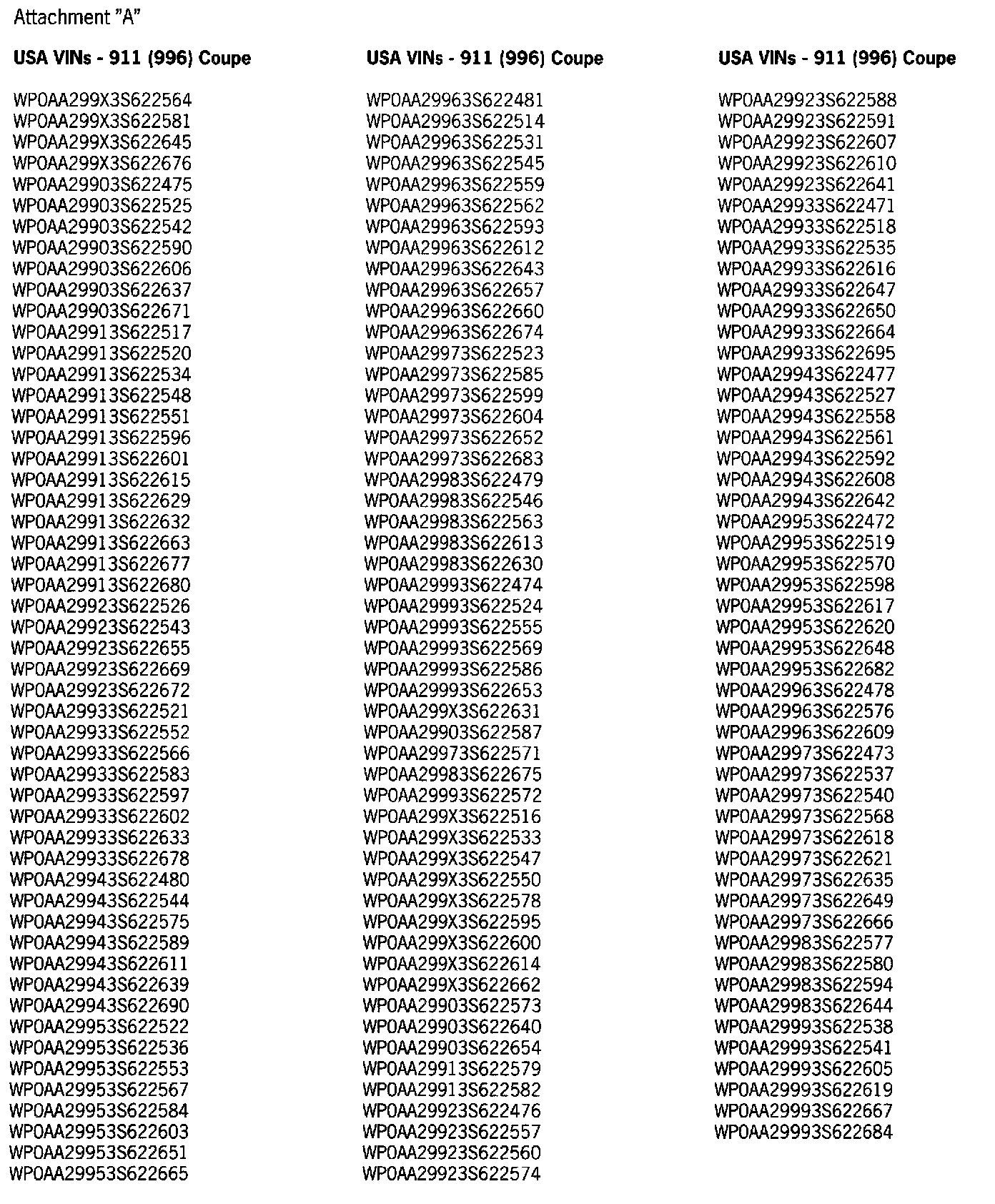 Refer to Attachment "A" to determine if a particular vehicle is eligible for this service action. Alternatively, the VIN can be checked in the Porsche e-DCS/WWS for confirmation of an open service action.