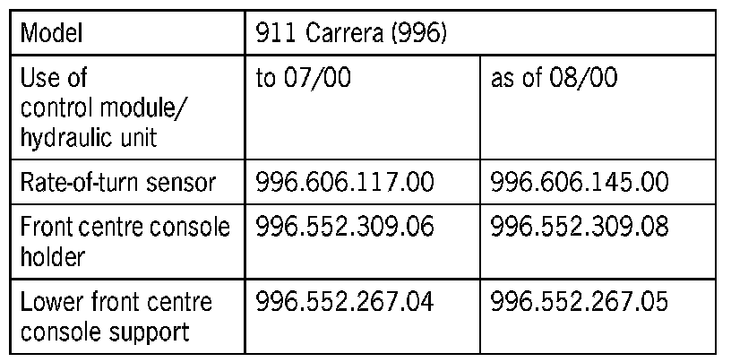 If the rate-of-turn sensor with part No. 996.606.147.00 is determined to be faulty, install the new rate-of-turn sensor with part No. 996.606.145.00.