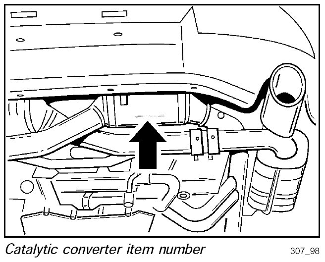 Figure 307_98 shows where the catalytic converter item number can be found on the vehicle.