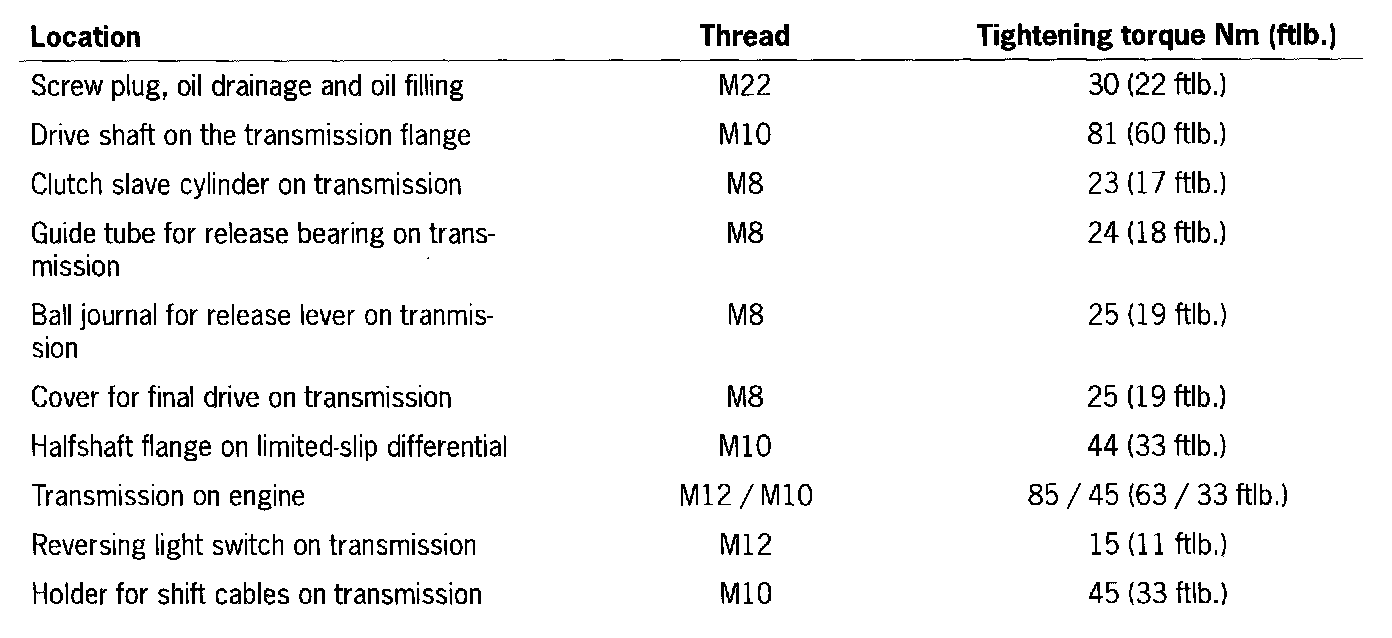 Manual Transmission Tightening Torques G96/00 And G96/01