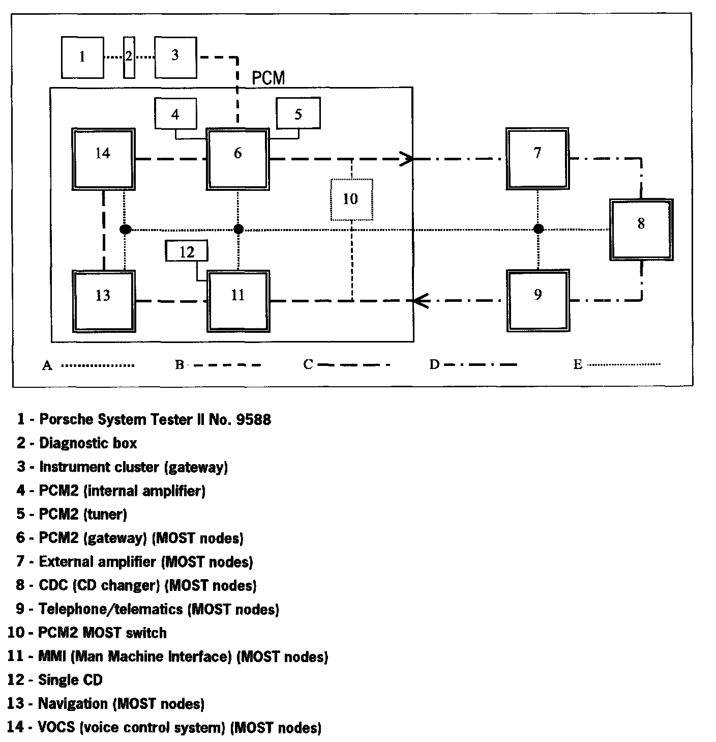 The PCM2 consists of at least two but a maximum of four MOST nodes, (Gateway, MMI and Navigation and VOCS (optional)), which communicate with each other electronically via the MOST. Data outside the PCM2 is transferred via the MOST.