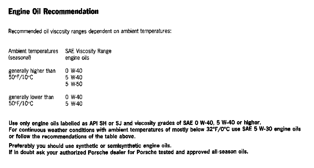 The viscosity of the engine oil for your Porsche has to be chosen according to the ambient temperature given in the engine oil recommendation table.