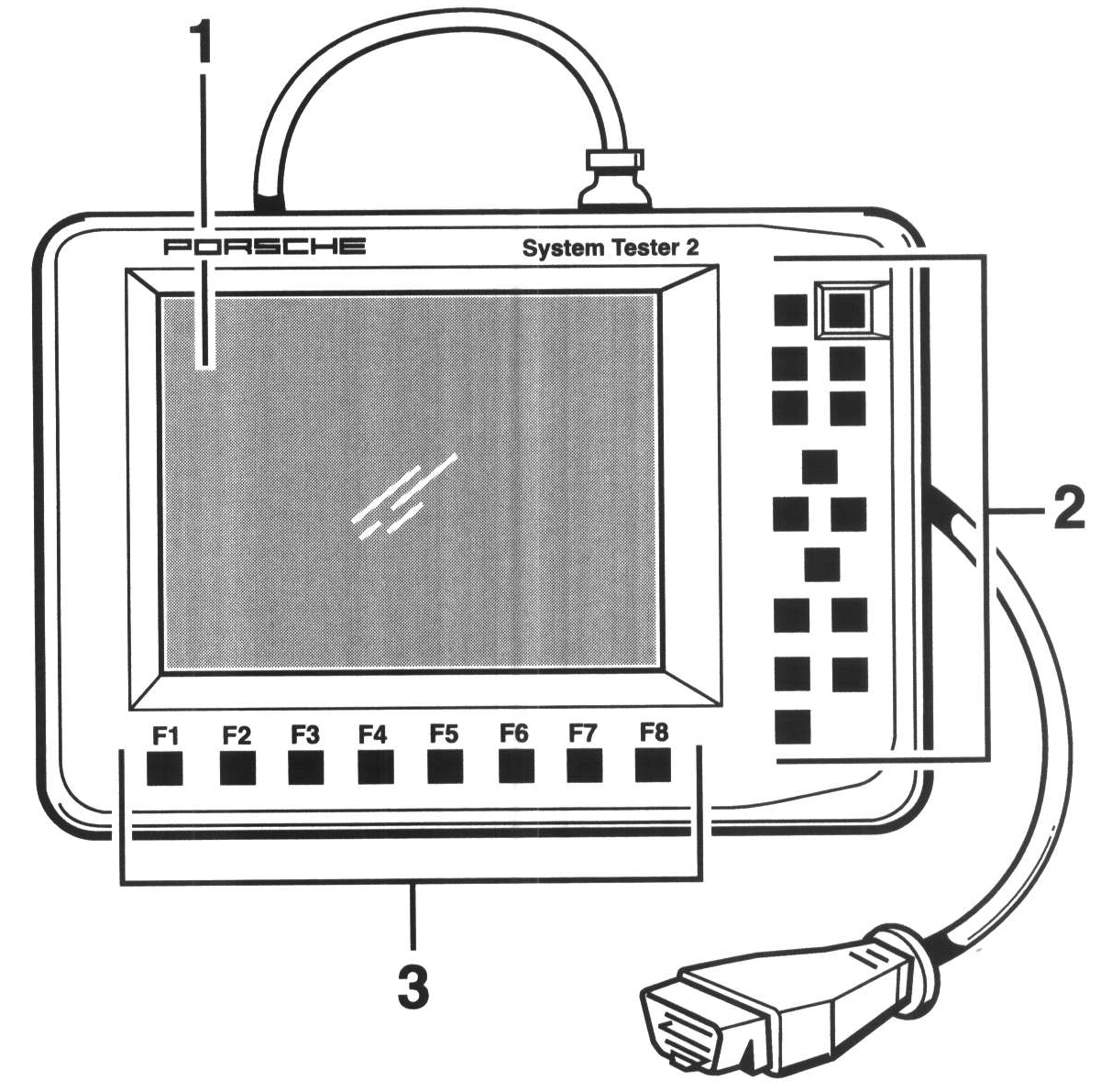 The Porsche System Tester II No. 9588 is a modular, portable diagnostic and measuring system. It can be used in any location to perform diagnostic tests on electronic control modules. It consists of a computer unit, a main memory, a hard disk, a VGA display panel, a rechargeable nickel metal hydride battery and a measuring unit for measurement of current, voltage and resistance values.