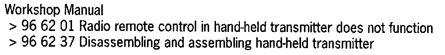 If the hand-held transmitter no longer operates after conversion, information and instructions as well as a resynchronization of the hand-held transmitter can be found in the Workshop Manual 96 62 01 "Radio remote control in hand-held transmitter does not function".
