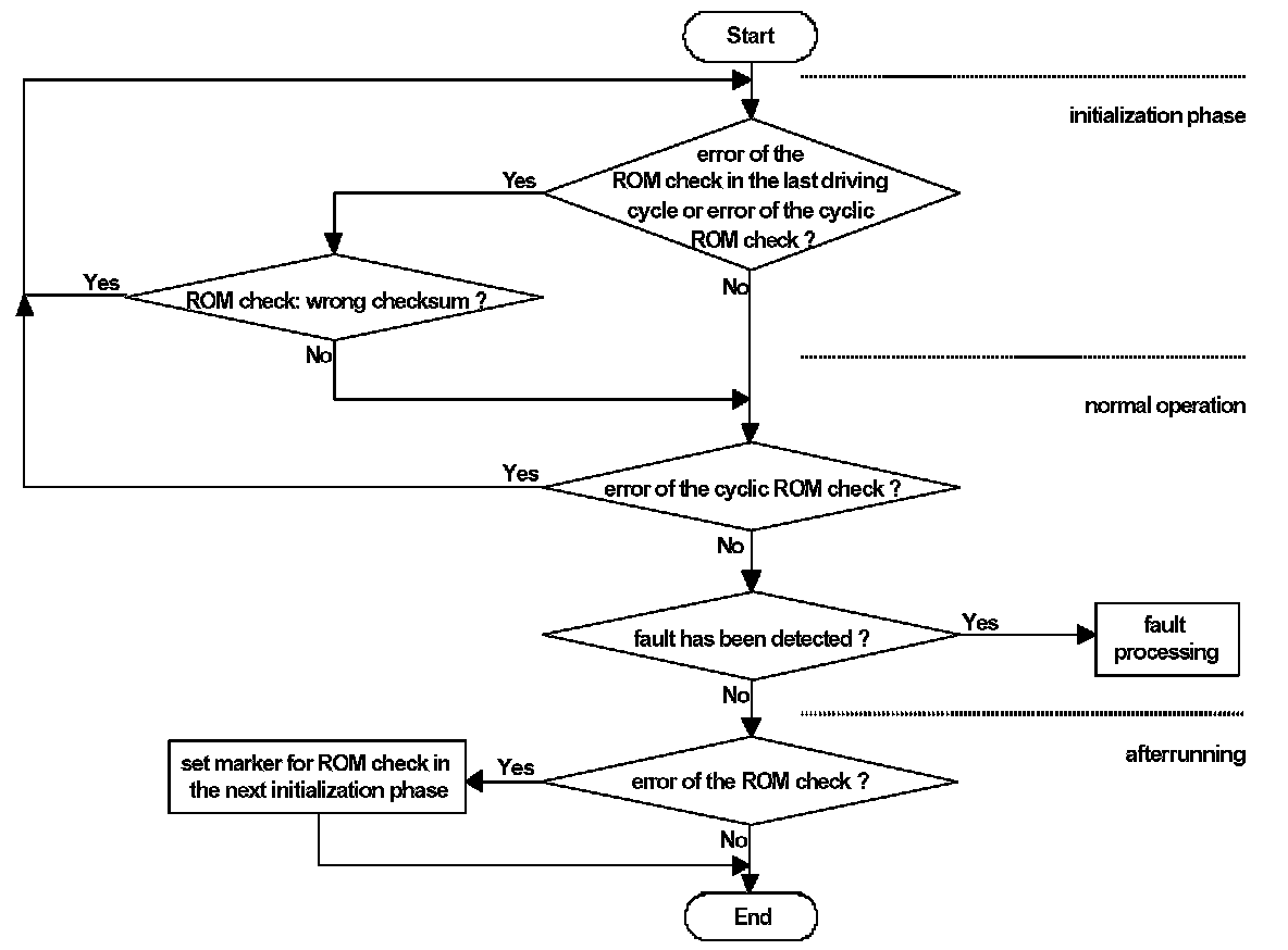 The ROM check is performed once per driving cycle after engine shutdown. In the case of a detected fault (a wrong checksum) the ROM check is repeated in the initialization phase of the following driving cycle. A detected fault in the initialization phase causes a RESET with no function running. Only a no-fault detection in the initialization phase will lead to a normal function and storing of the ROM - fault.