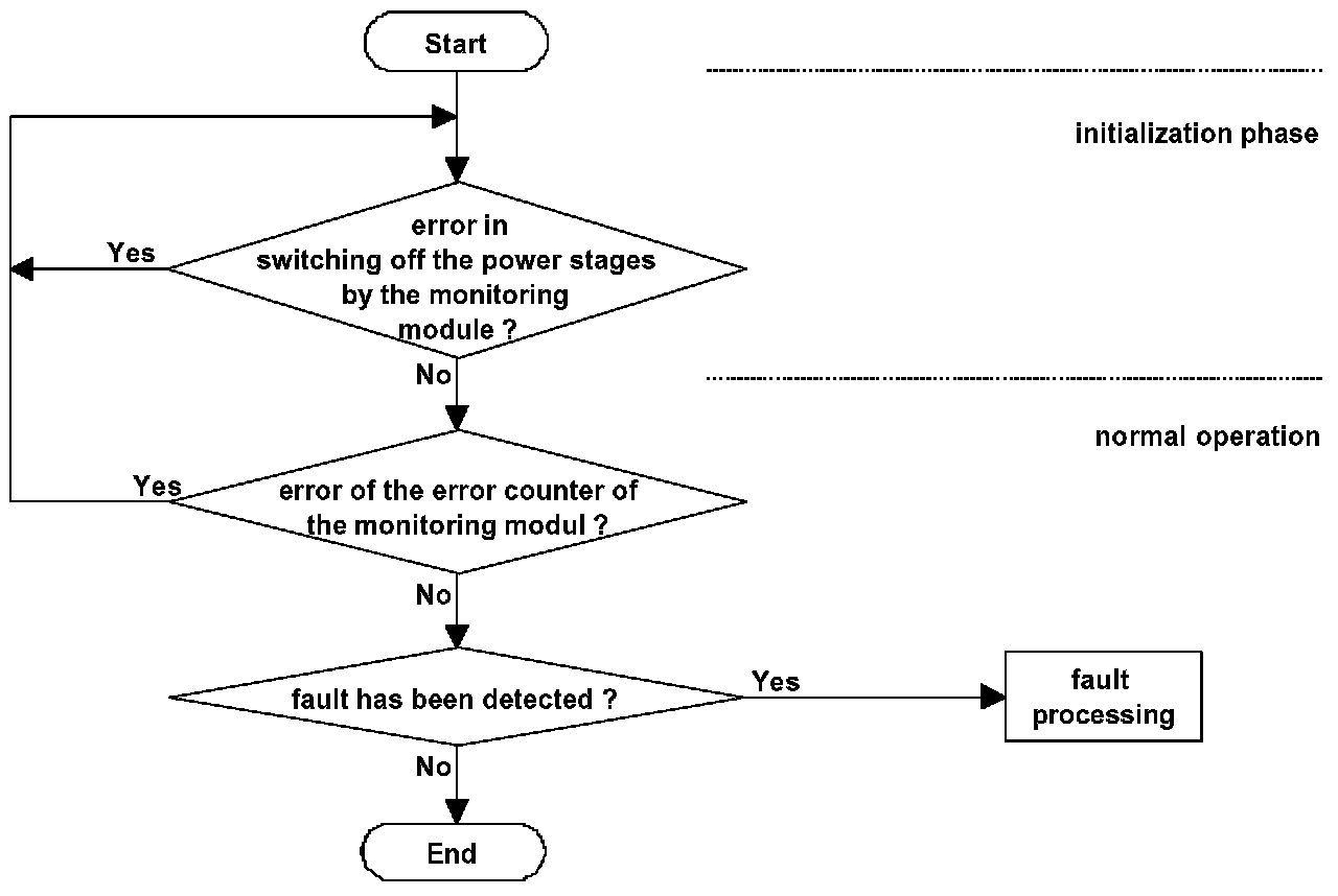 The switching off of the power stages by the monitoring module is checked once per driving cycle in the initialization phase. If the switching off of the power stages by the monitoring module is impossible a RESET is performed with no function running. Only no-fault detection will lead to a normal function and storing the RST - fault.