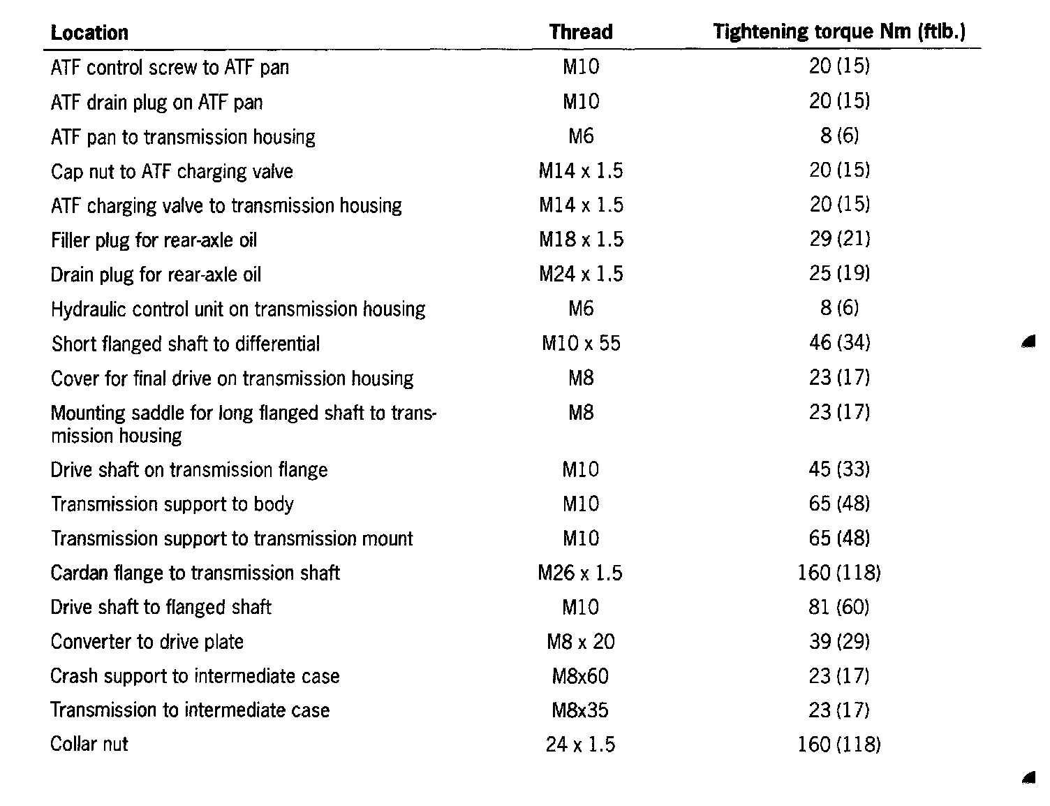 Tightening Torques for Tiptronic transmission