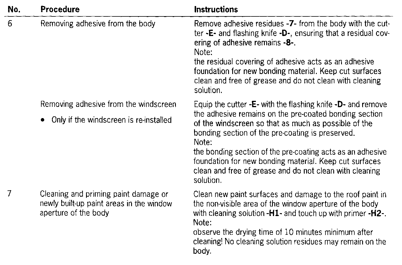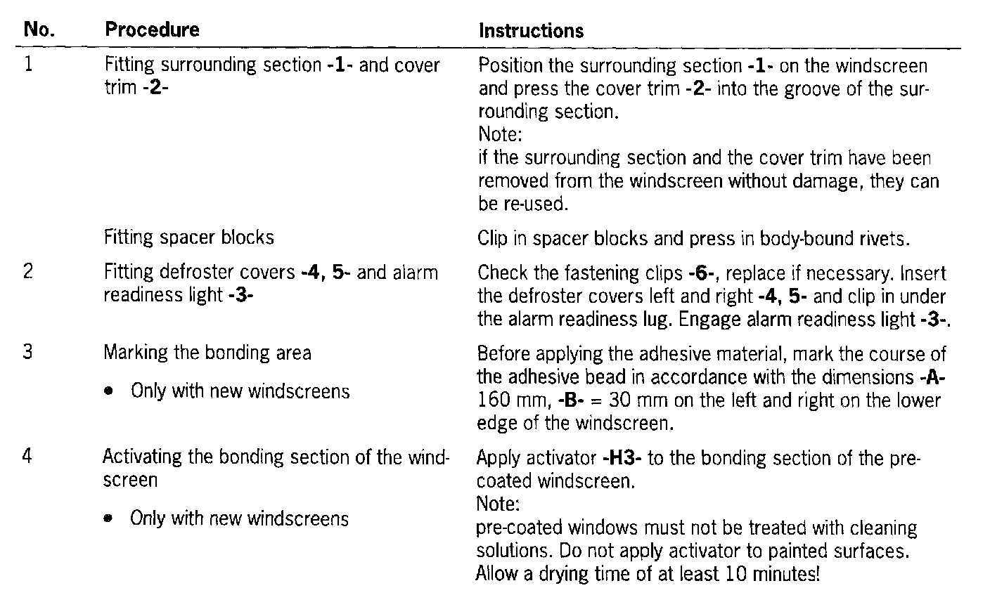 - Time between applying adhesive and inserting windscreen: max. 10 min