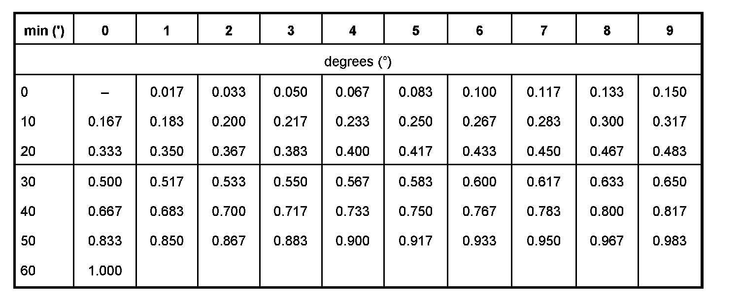 ^ Example 1: Toe 17 min (17') = 0.283 decimal degrees according to table. Procedure for this: The imaginary line starting at the top of the 7 mins column moving downwards and the line starting on the left in the 10 mins row moving right meet at point/column 0.283.